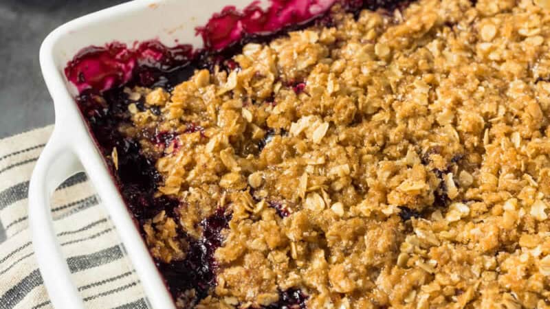 Enfournez le crumble aux fruits rouges et à la noix de coco pendant 35 à 40 minutes, ou jusqu’à ce que la surface soit dorée et les fruits rouges soient légèrement bouillonnants.