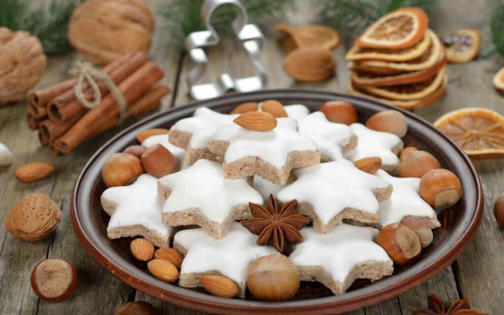 Les Zimtsterne sont des étoiles de Noël traditionnelles allemandes, célèbres pour leur saveur de cannelle. Leur texture est unique, mi-moelleuse, mi-croquante, et elles sont souvent recouvertes d’un glaçage blanc et brillant.