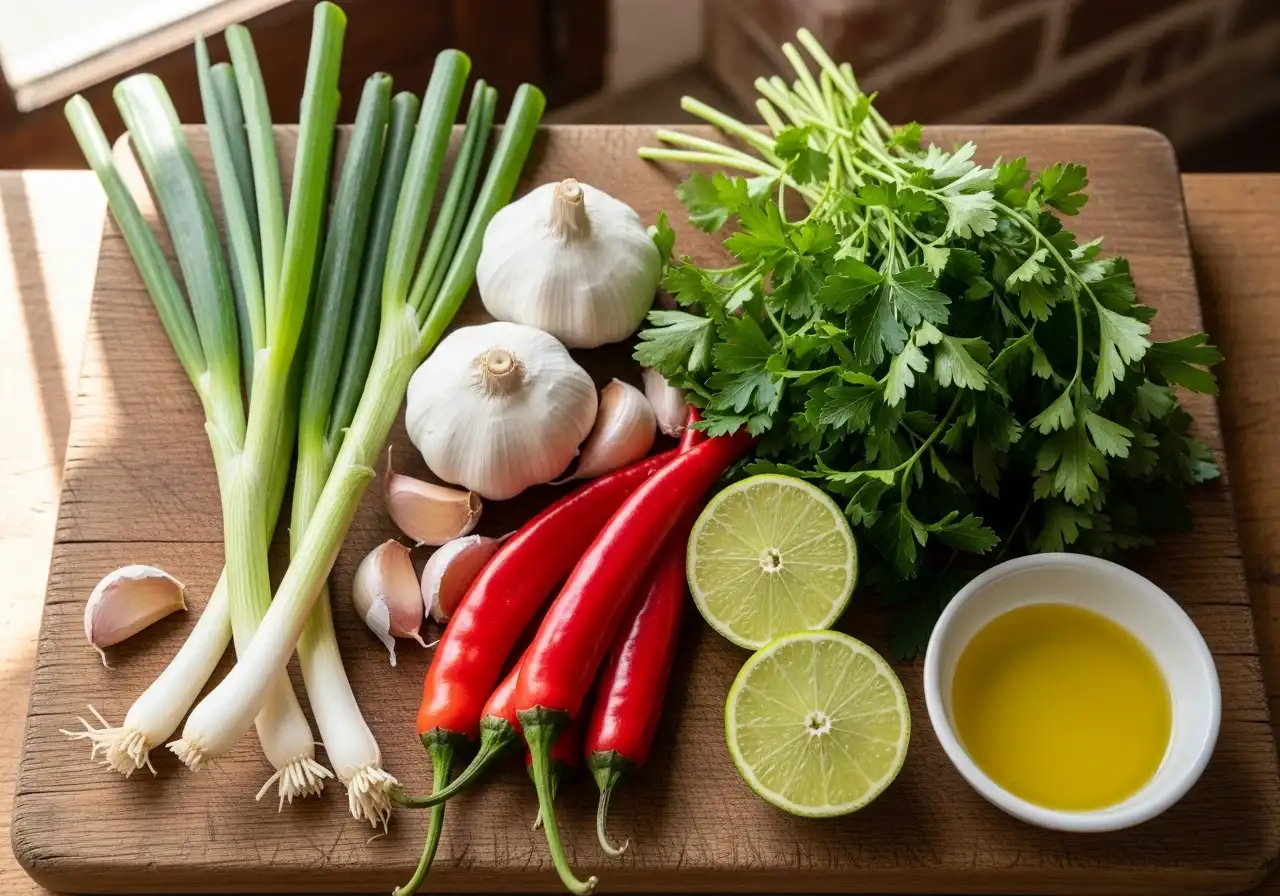 Traditionnellement, cette sauce est réalisée juste avant de servir, pour conserver toute la fraîcheur des herbes et la puissance aromatique de l’ail et du piment. Le mélange est ensuite relevé par du jus de citron vert et une touche d’eau chaude qui enrobe les ingrédients, créant ainsi une émulsion légère et parfumée.