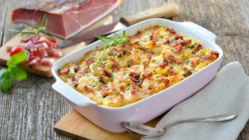 Disposez maintenant le fromage et mélangez, puis terminez par le bacon. Couvrir le moule de papier aluminium et mettre au four à 180°C pendant environ 45-50 minutes . Le temps de cuisson varie en fonction de l’épaisseur donnée aux tranches ou cubes de pomme de terre.
