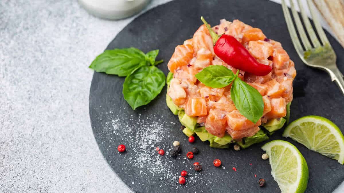 Le tartare de saumon à l’avocat est une recette simple et savoureuse qui se compose principalement de saumon cru et d’avocat.
