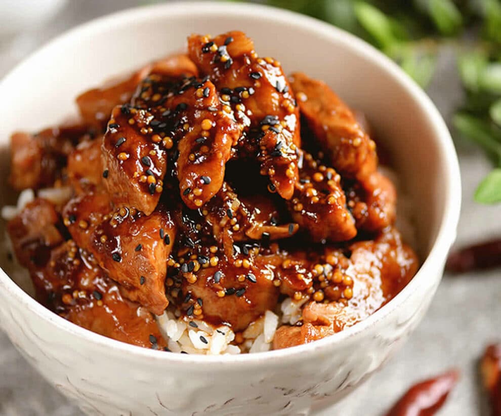 Enfin, servez l’émincé de porc au miel sur du riz blanc ou des nouilles asiatiques. Parsemez de graines de sésame et de ciboulette ou d’oignon vert émincé pour la garniture, si vous le souhaitez.