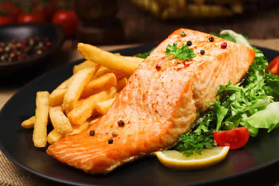 Lorsque vos pavés de saumon sont cuits, servez-les immédiatement, accompagnés d’une bonne salade bien assaisonnée.