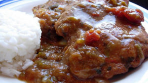 Y faire revenir l’oignon et les poivrons préalablement émincés.