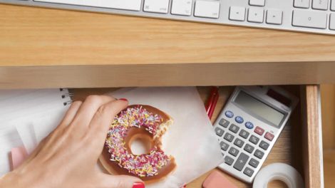 Manger équilibré au bureau. Pris en 5 minutes devant son ordinateur, composé d’aliments de fast food ou festin au restaurant, les clichés…
