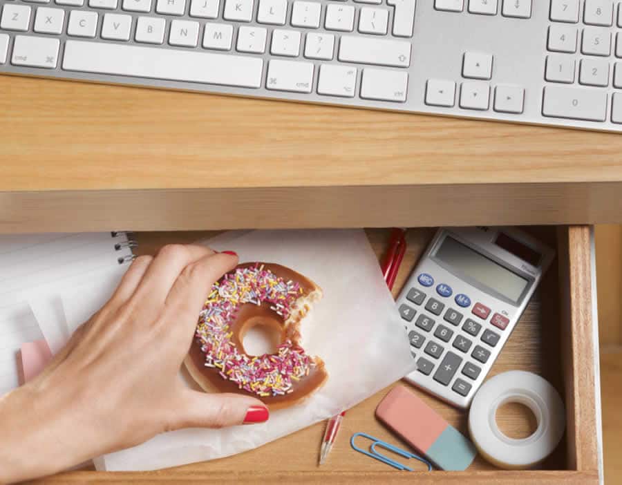 Manger équilibré au bureau. Pris en 5 minutes devant son ordinateur, composé d’aliments de fast food ou festin au restaurant, les clichés…
