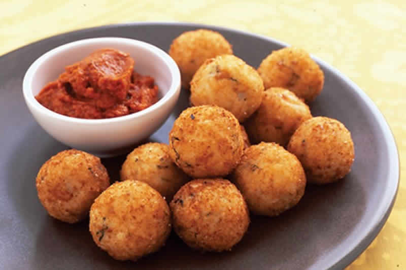 Dans votre main humide, formez une 1/2 boule, garnissez avec une petite cuillère de bolognaise mettre un petit dés de mozzarella et provolone et fermer avec l’autre 1/2 moitié de riz former une boule de la grandeur d’une orange.