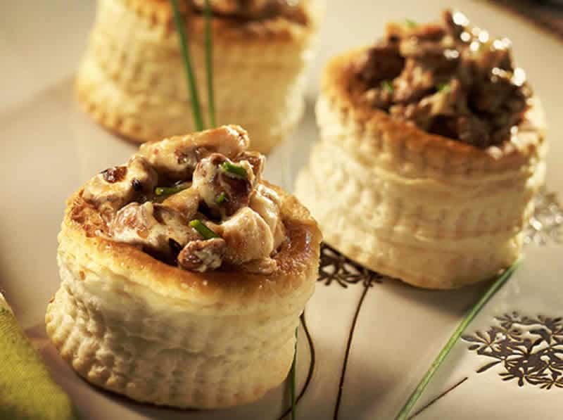 Garnir les vol-au -vent de préparation, les disposer sur la plaque de four préparée, et enfourner durant 20 min à 60°C. Déguster chaud avec une salade.