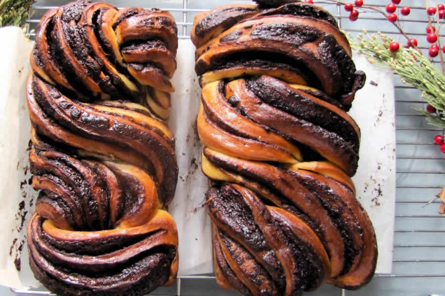 Fariner le plan de travail,dégazer la pâte. L’étaler en un rectagle de 50×30 cm, puis recouvrir toute la surface de farce aux noisettes. rouler la pâte en partant du plus long côté et découper le rouleau dans le sens de la longueur. Tresser les deux boudins en prenant soin que la partie coupée soit sur le dessus. Déposer la tresse dans les deux moules à cake.