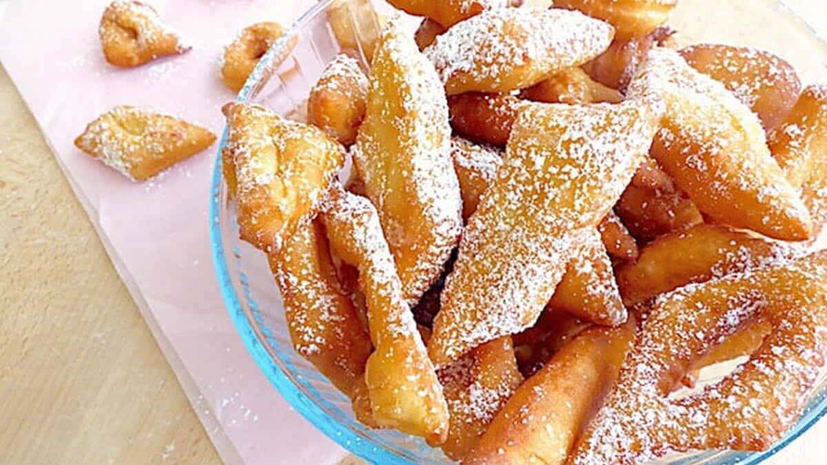 Plonger les bugnes dans l’huile bien chaude jusqu’à ce qu’elles soit dorées puis déposer-les sur un papier absorbant et saupoudrer de sucre glace.