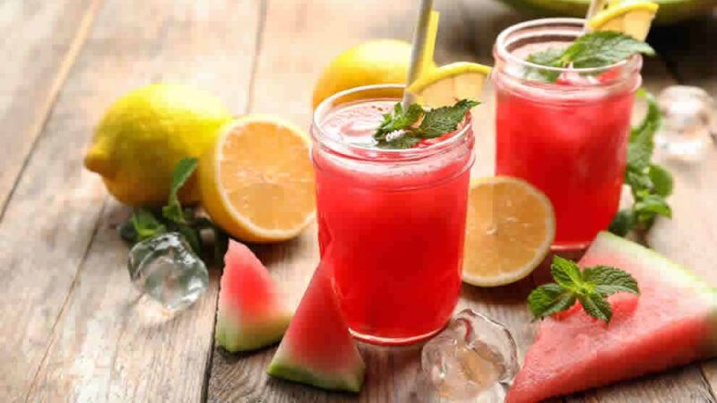 Enfin, verser votre cocktail à la pastèque dans deux verres et servir avec des glaçons, puis décorer-les avec de la menthe et des tranches de citron.