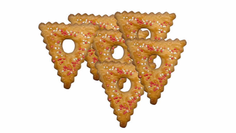 Étaler ensuite la pâte au rouleau sur une surface farinée et sur une épaisseur de 3 mm environ. Découper des triangles (à la roulette à pizza cannelée) et ôter au centre un cercle grâce à l’évidoir à pomme. Placer vos triangles sur les plaques de four recouverte de papier sulfurisé.