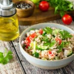 6. Pendant ce temps., mouiller les graines de couscous avec 400 g d’eau chaude, ajouter 40 g d’huile d’olive, saler et poivrer. Mélanger et laisser gonfler pendant 5 minutes ..