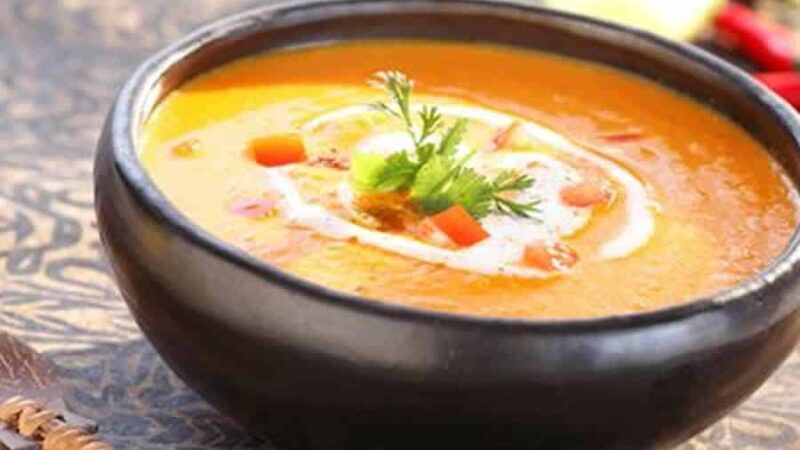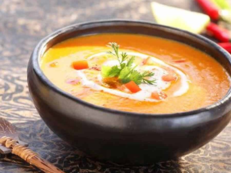 - Versez immédiatement la crème de tomate et coco dans des bols ou assiettes creuses.