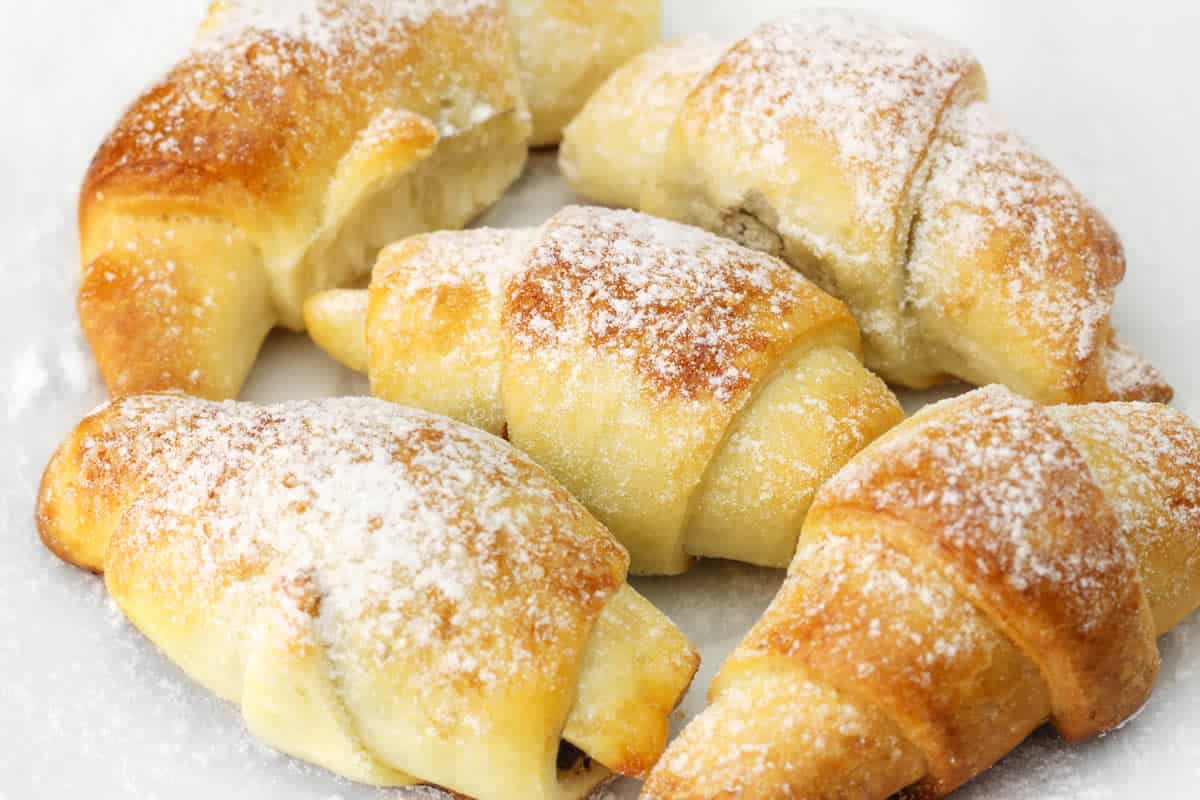 Farcir de la pâte à tartiner ou de la confiture au choix. Rouler jusqu’à la pointe, puis les déposer sur une plaque recouverte de papier sulfurisé.