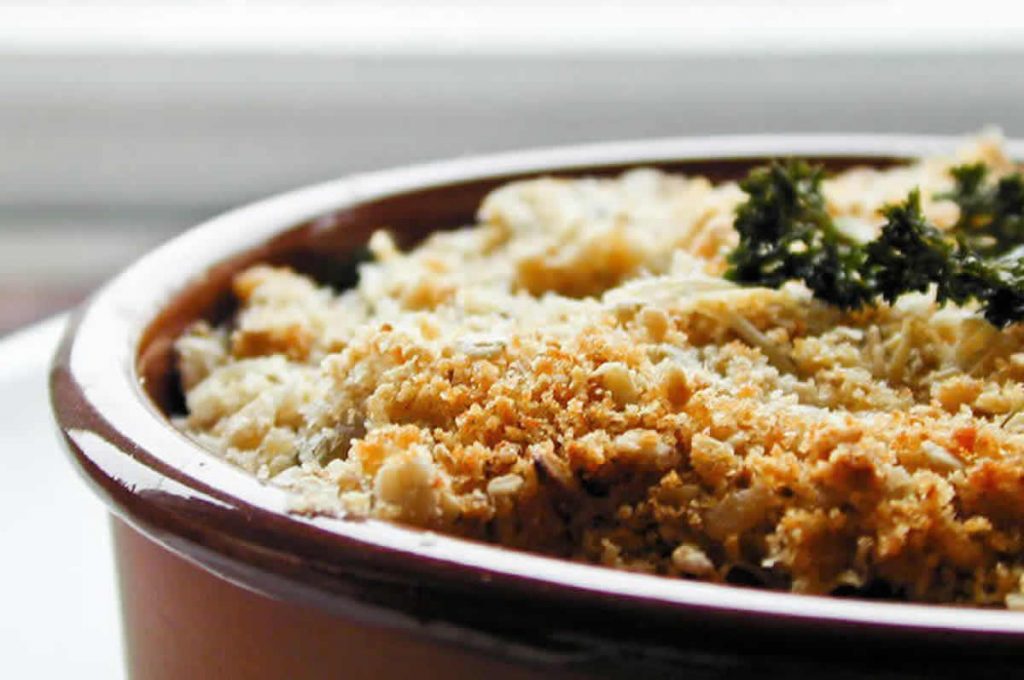 Enfin enfourner votre crumble de courgettes au boursin pendant 25 à 30 minutes de cuisson à 180°C, jusqu’à ce que le crumble soit doré.