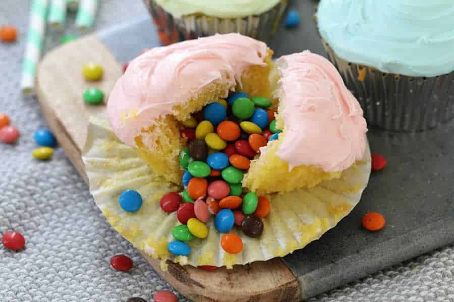 Cupcakes surprise au M&M avec thermomix. Des cupcakes délicieux à la vanille, remplis de mini M&Ms et garni d’un glaçage crémeux. Une recette simple à réaliser au thermomix chez vous.