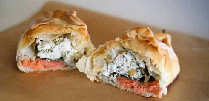 Mettre la garniture froide au milieu de chaque cercle et plier la pâte en 2. Mouiller un peu les bords et les fermer à l’aide d’une fourchette.