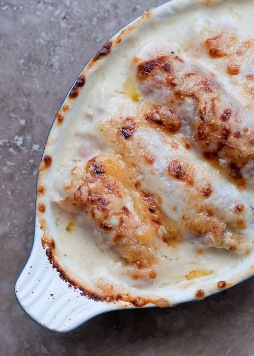 A la sonnerie, napper les endives au jambon de la sauce béchamel.