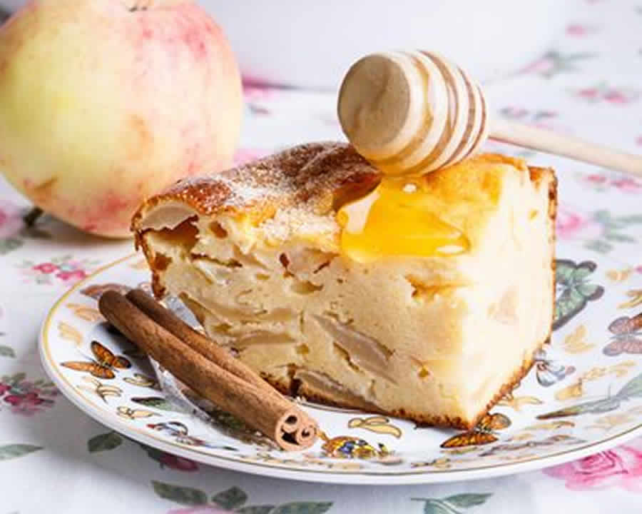 Mettre les pommes réservées au fond du plat, ajouter la préparation.