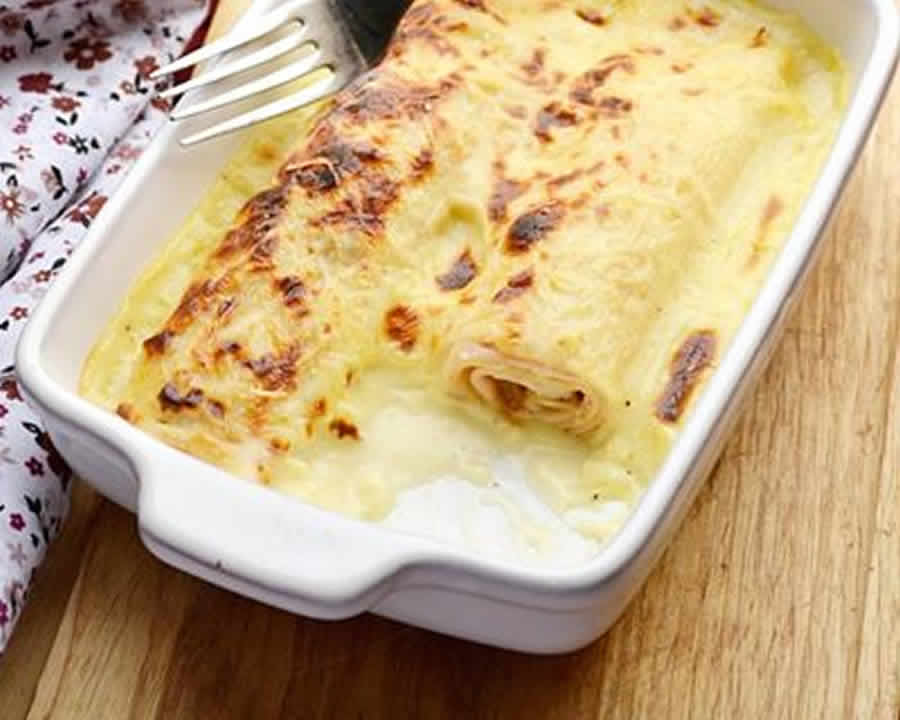 Pour chaque crêpe, garnir celle-ci d’une 1/2 tranche de jambon blanc, d’une cuillère à soupe de duxelles, rouler l’ensemble.