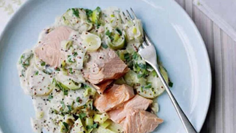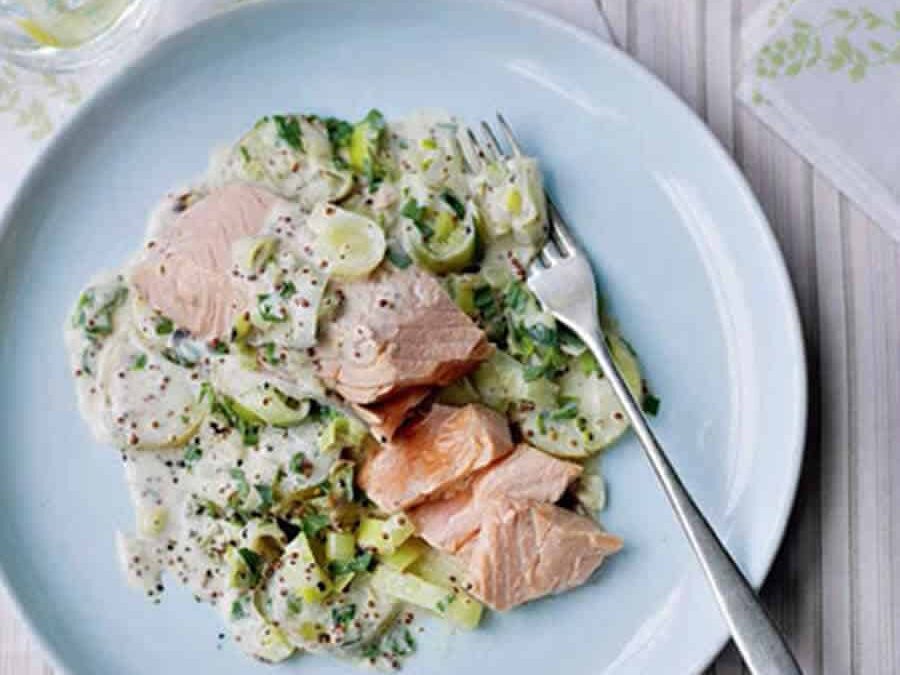 Servez immédiatement le saumon et les poireaux nappés de leur sauce crémeuse au vin blanc.