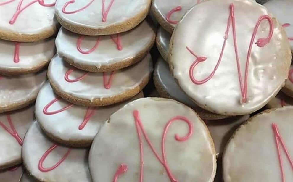 Une fois le glaçage sèche, colorer le reste du glaçage avec le colorant rouge et écrire un joli « N » à la poche à douille.