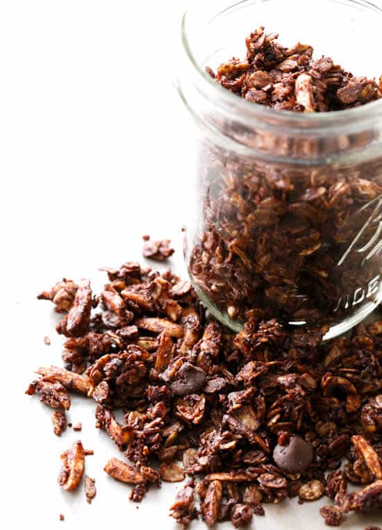 Granola amande et chocolat au thermomix. Voici une recette de granola amande et chocolat, simple et facile à réaliser chez vous au thermomix. Accompagner d’un produit laitier et quelques fruits frais. Si vous préférez un granola moins sucré, n’hésitez pas à remplacer les 150 g de sucre par 50 g de miel.