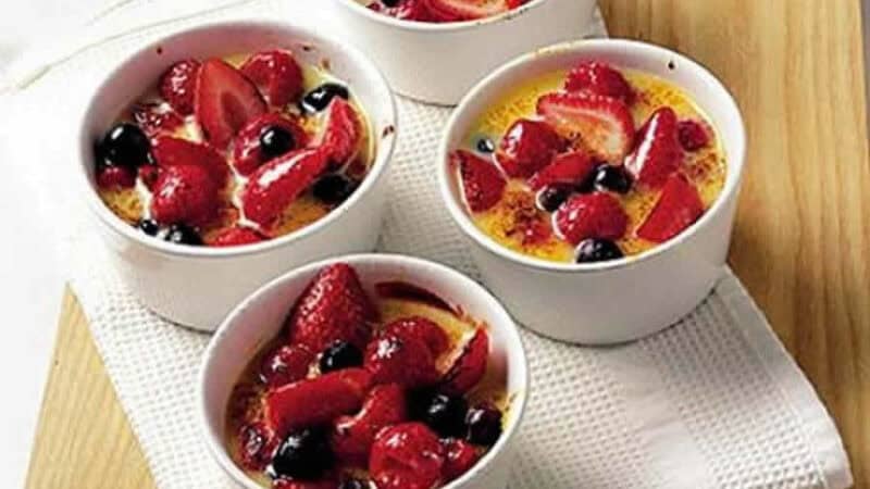 Mettre les fruits dans les ramequins, verser la préparation dessus et passer pour 2 à 3 minutes sous le grill du four.