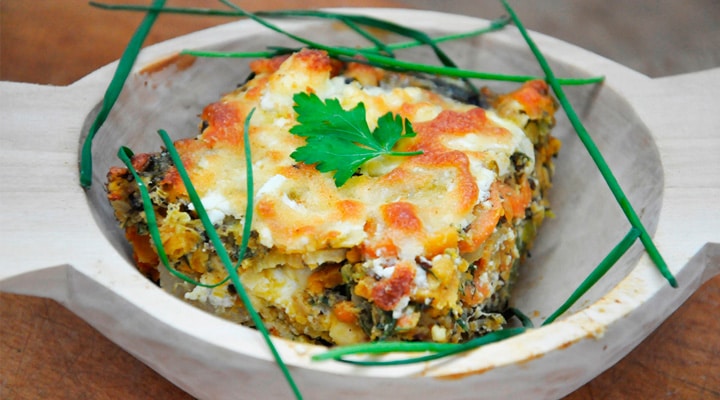 7. Couvrir le fond d’un plat à gratin d’une couche de lentilles, d’aubergine, de courgette et parsemer de persil. Renouveler jusqu’à épuisement des ingrédients en finissant avec une couche de lentilles.
