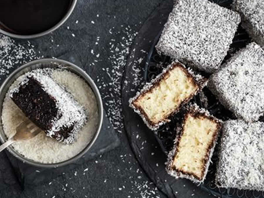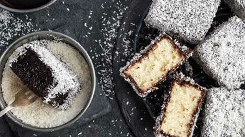 Le lamington est un gâteau traditionnel australien constitué de rectangles de gâteau éponge recouverts d’un glaçage au chocolat et roulé dans de la noix de coco séchée.