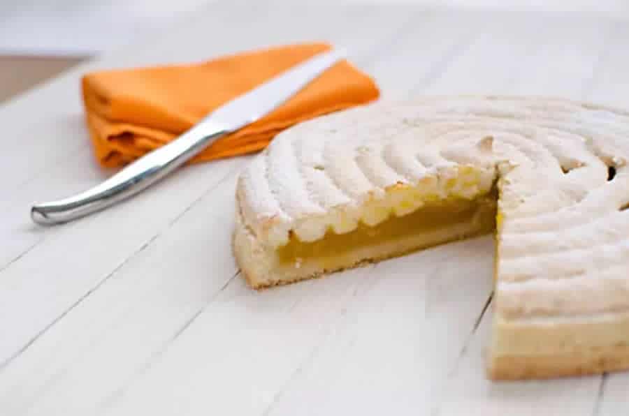 A la sortie du four, saupoudrer la surface de la tarte de sucre glace et décorer de quelques zestes de citron confits.