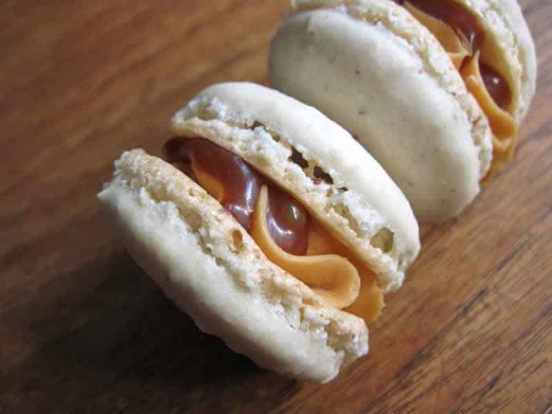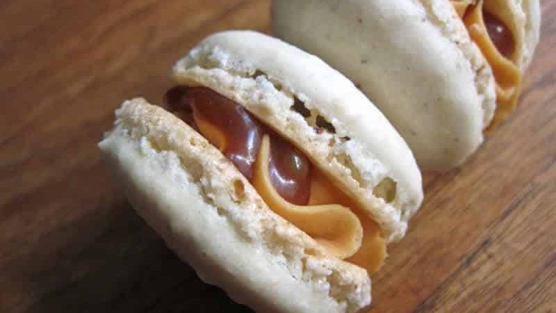 15. Prendre une coque de macaron, mettre une petite cuillèrée à café de confit d’oignon puis un cercle de crème au foie gras. Mettre une autre coque pour fermer.