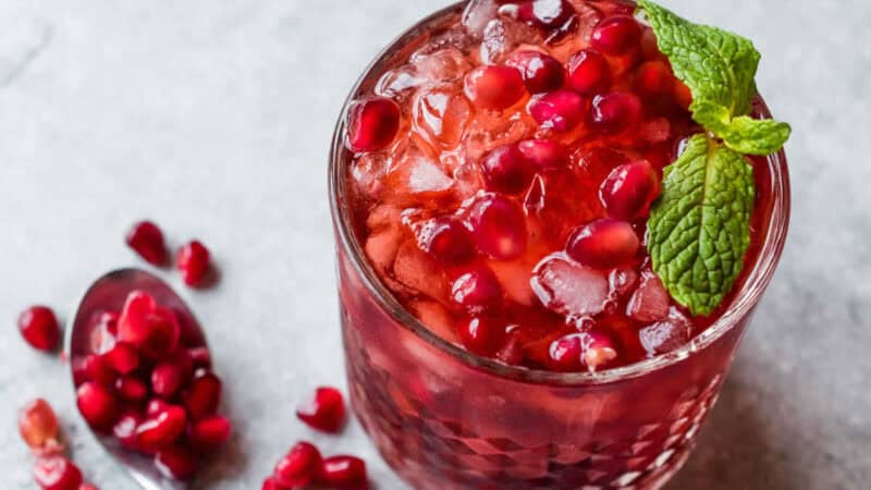 Enfin, remplir les verres d’eau gazeuse et ajouter les grains de grenade, des tranches de citron et la glace pilée à la fin.