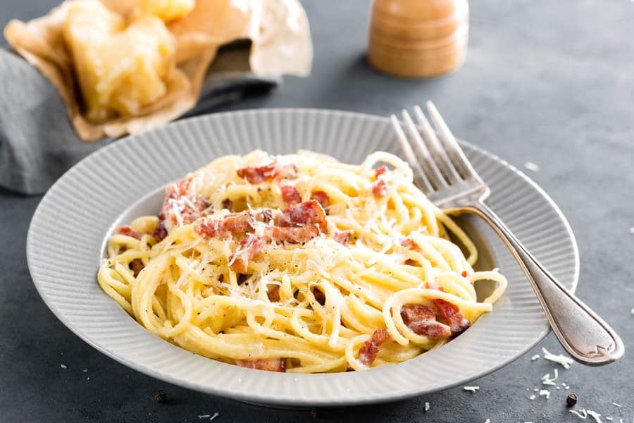 Servir vos Pâtes à la carbonara en saupoudrant de parmesan râpé.