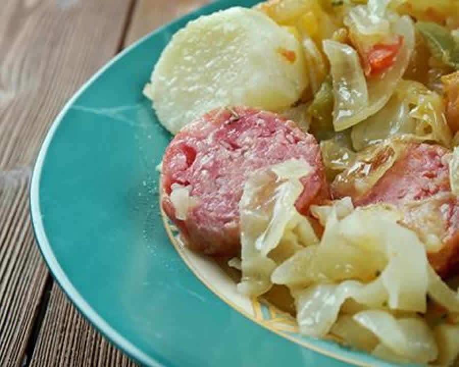 A la sonnerie, versez le chou dans un plat de service, ajoutez les pommes de terre et les carottes puis les saucisses et arrosez du jus de cuisson.