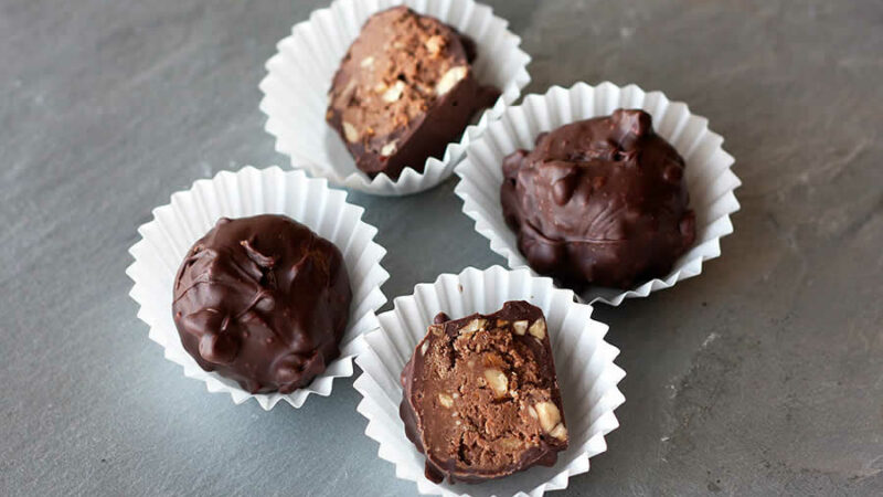 - Lorsque la ganache a une texture plus ferme, façonnez de petites boules à l’aide de deux cuillères ou en roulant la ganache entre vos mains légèrement farinées.