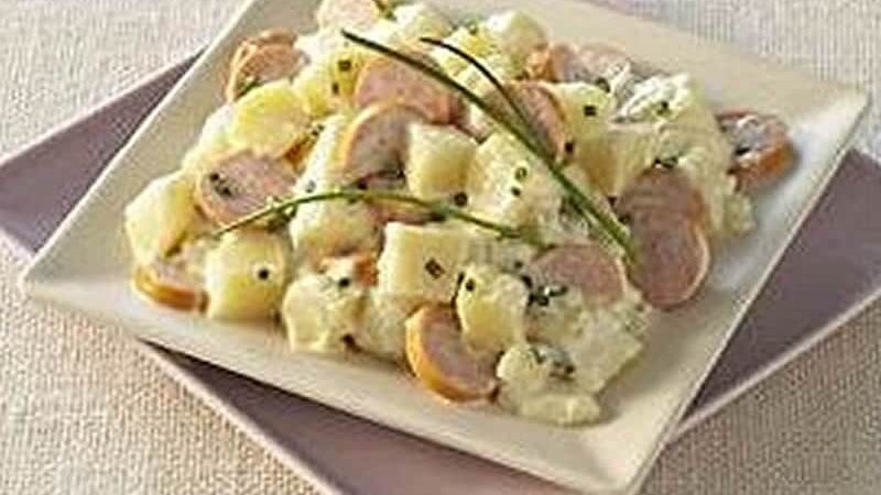 Ajoutez ensuite les saucisses et les cornichons en rondelles, mélanger délicatement.