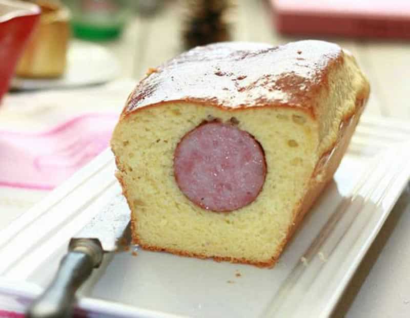 6 – Placer un rectangle dans votre moule à cake, placer le saucisson « épluché » et recouvrir le de l’autre rectangle de pâte en appuyant légèrement autour. Et Faire lever au four à 50°c pendant 30 minutes.