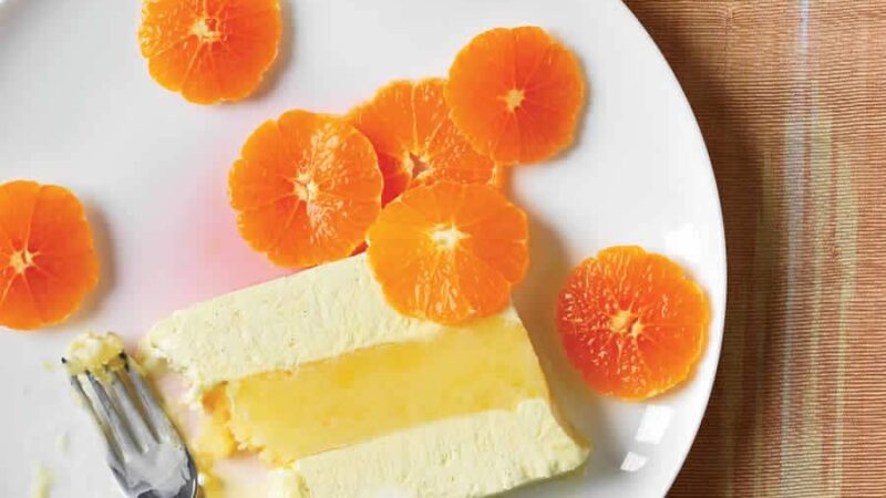 Pour le montage versez la moitié de votre préparation vanille dans un bac, lissez la surface avec une spatule puis versez en dessus la préparation orange et à la fin l’autre moitié de vanille.