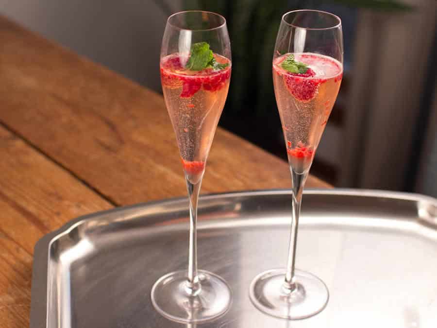 Ajouter le Champagne au moment de servir dans des flûtes, avec une fraise ou une framboise et des feuilles de menthe dans chaque verre.