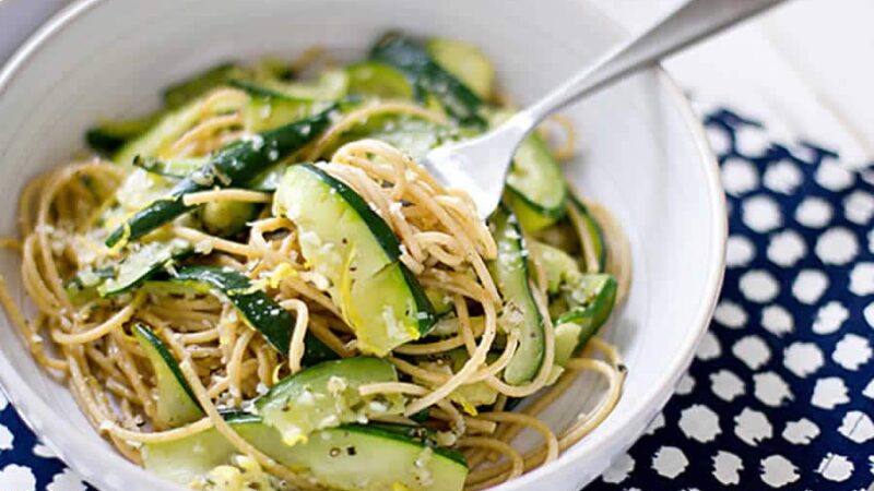 Égoutter les spaghetti et verser les dans le récipient contenant la préparation à base de courgettes.