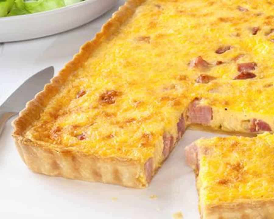 Étalé votre pâte brisée et la mettre dans moule à tarte ( n’oublier pas de piquer le fond de la tarte avec une fourchette ), puis disposer le jambon, les légumes puis le comté.