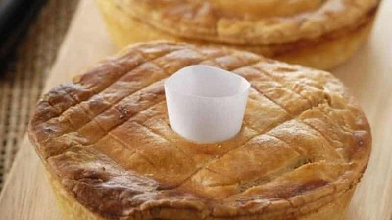 9- Recouvrir de la seconde pâte feuilletée. Scinder les bords et faites un trou au milieu de la pâte pour faire échapper la vapeur. Badigeonner avec le jaune d’oeuf si vous le souhaitez.